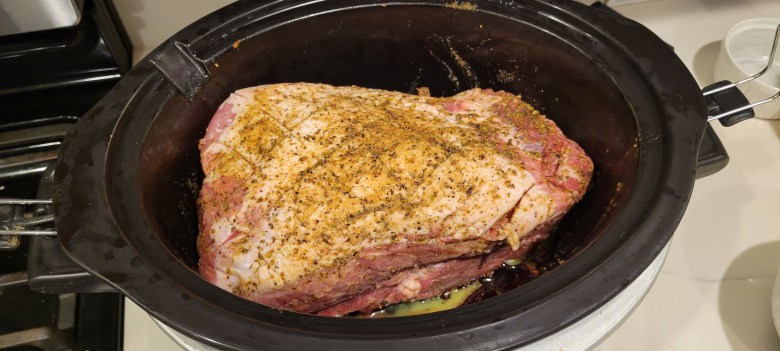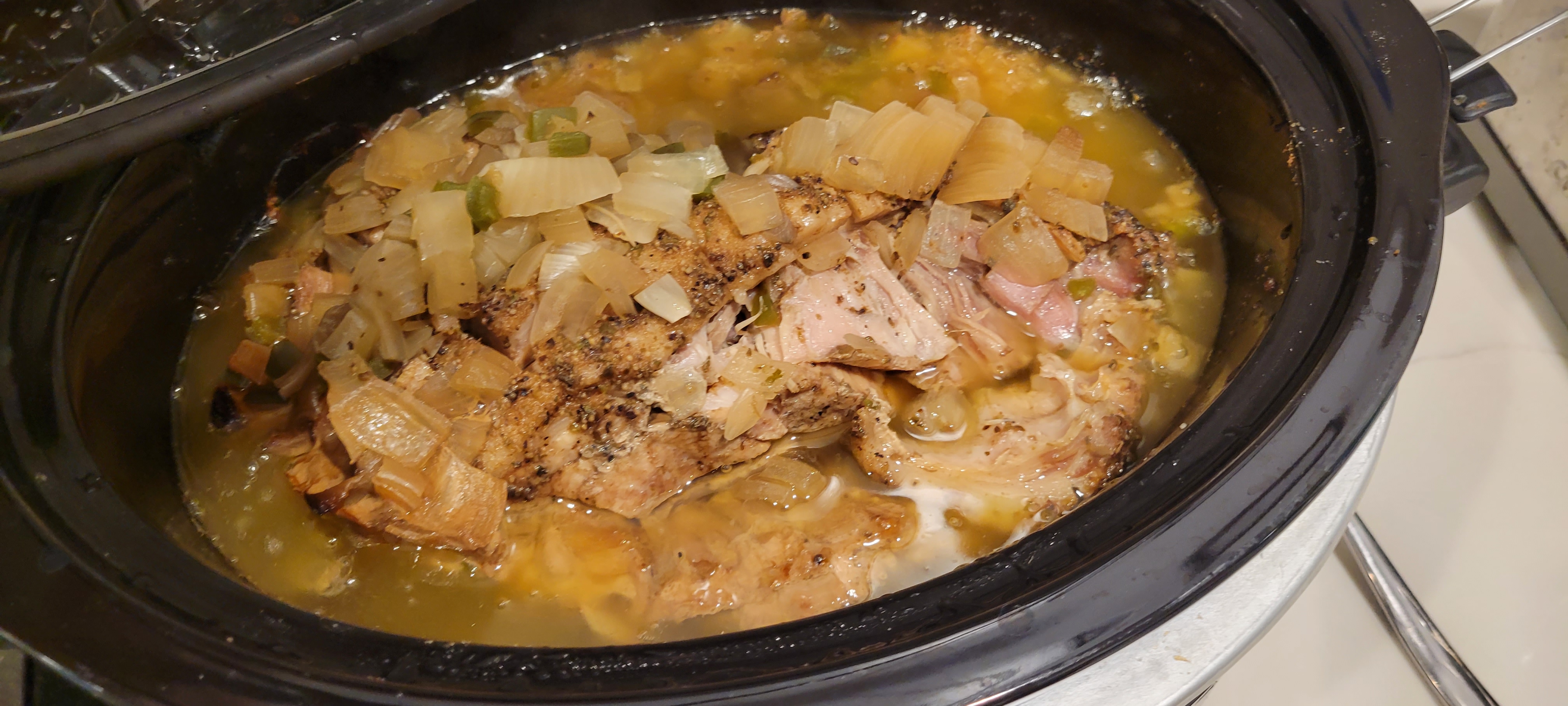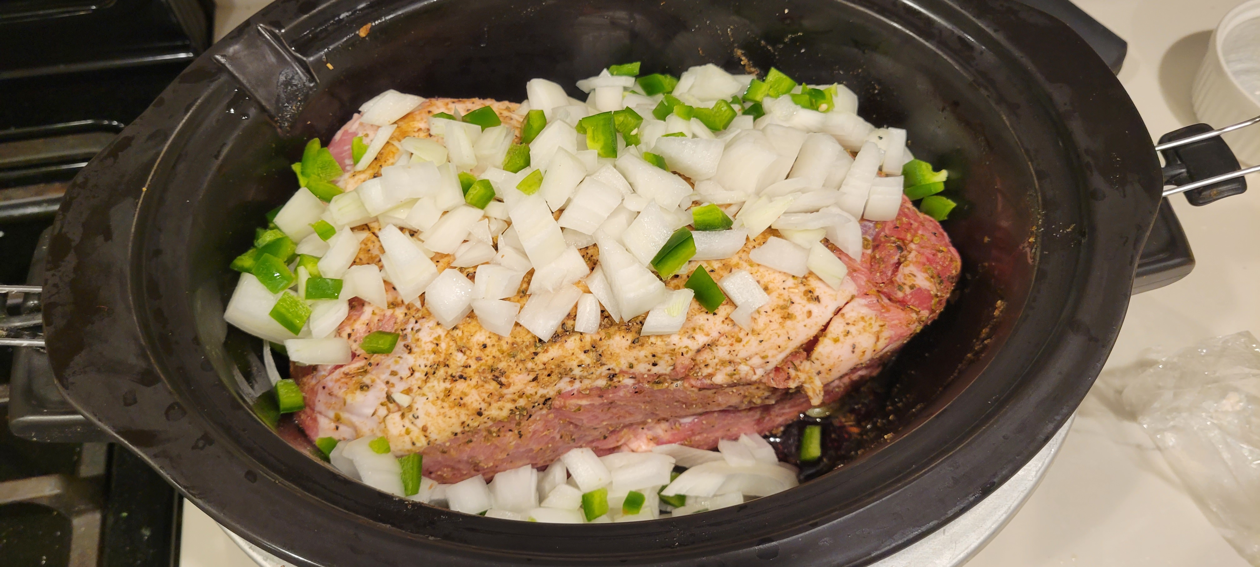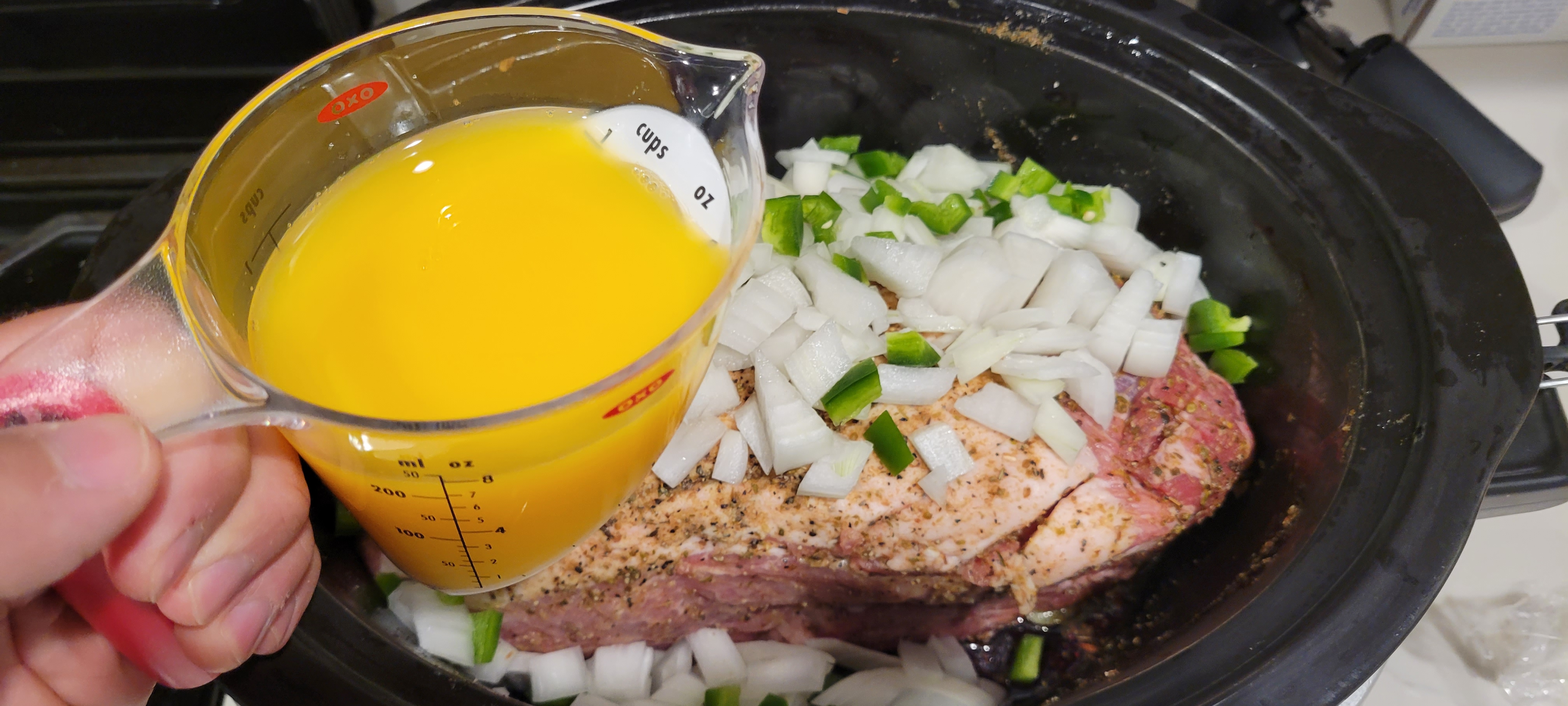- When you’re ready to start cooking, unwrap the seasoned butt, and place it in the slow cooker. Cover it with the onions and peppers, and then pour the cup of orange juice over the top. Set the slow cooker for 10 hours on low