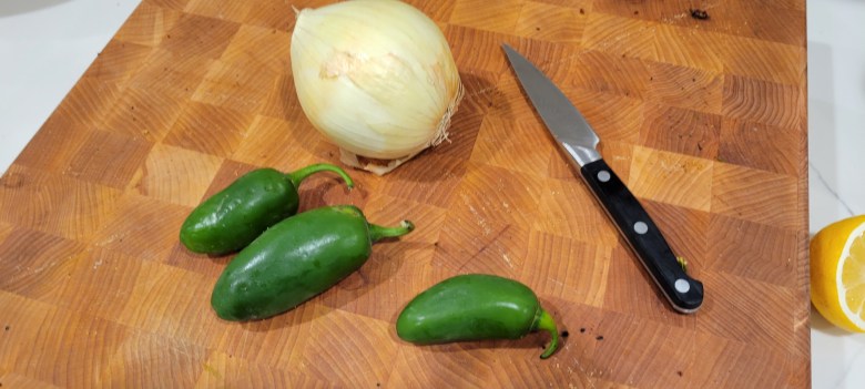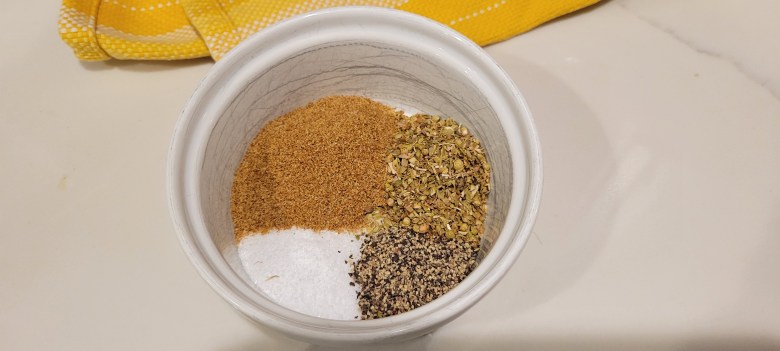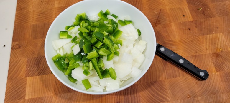 - Combine the cumin, oregano, salt and pepper in a bowl. Wash and dice the onion and peppers.