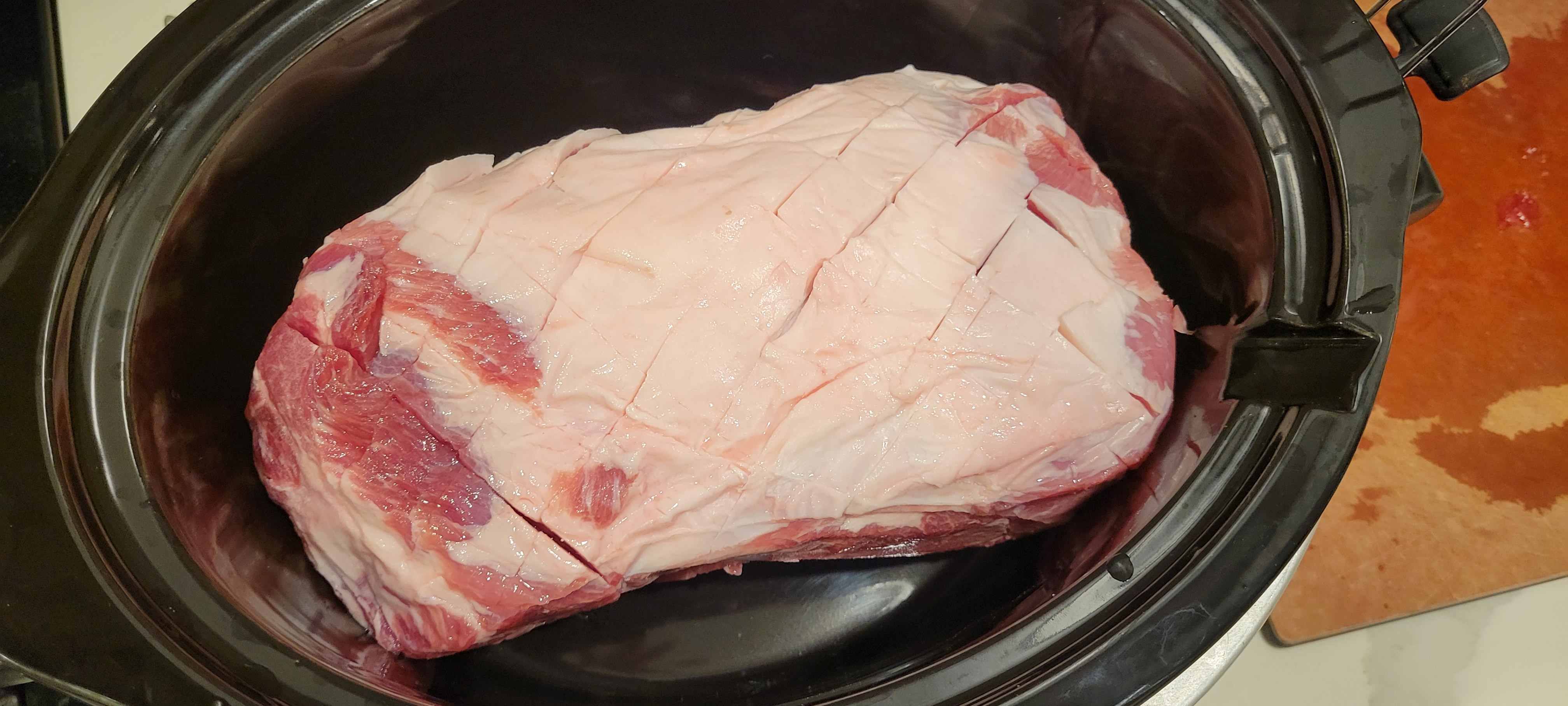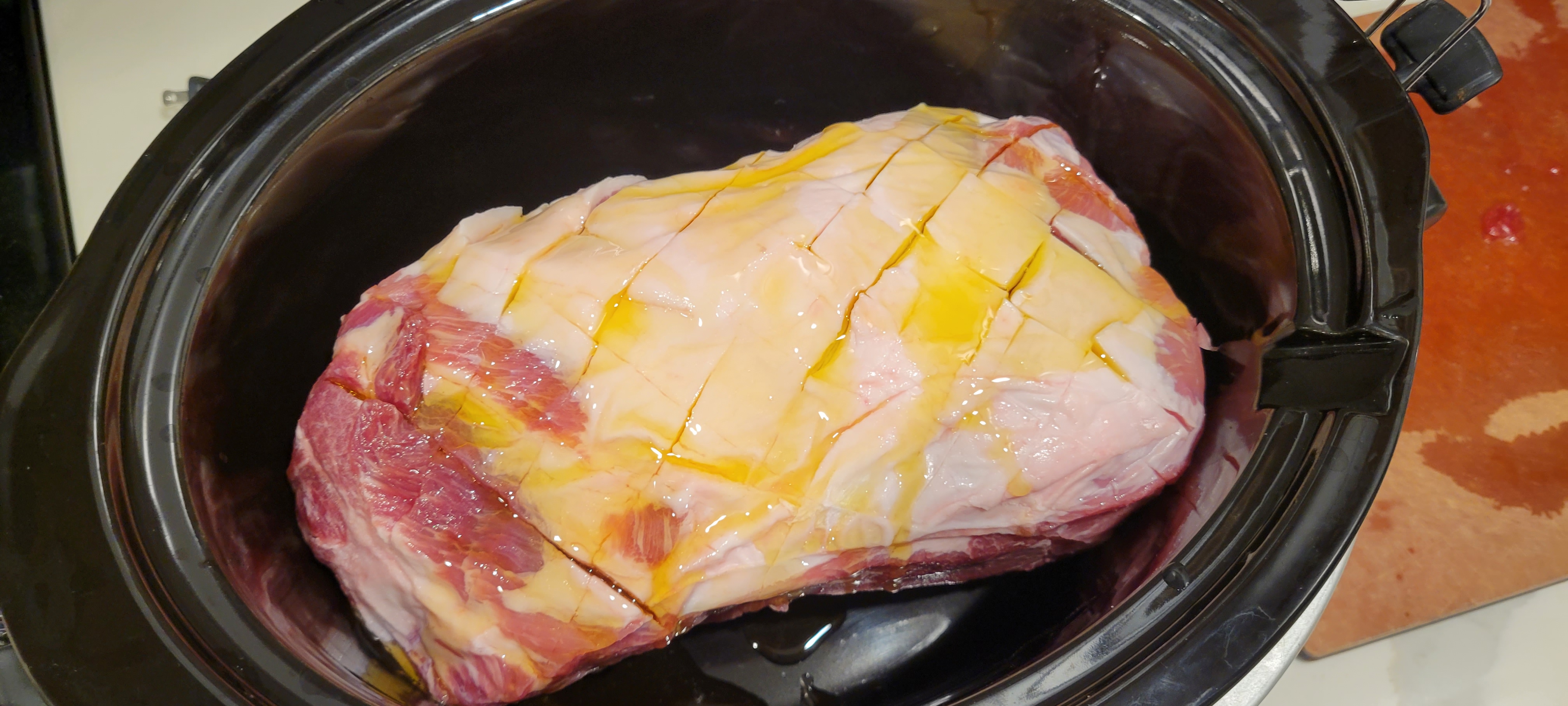 - Cut a cross-hatch pattern all over the pork, and then coat it with the olive oil, and then coat the outside of it with the spice mixture.