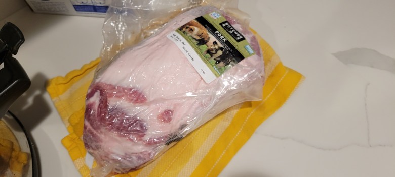 - Wrap the seasoned pork butt in plastic wrap, and place it in the fridge. Store the chopped veggies in a covered bowl or ziploc bag in the fridge.