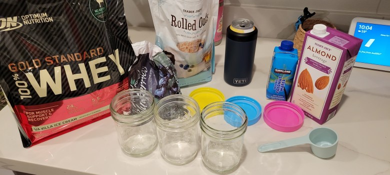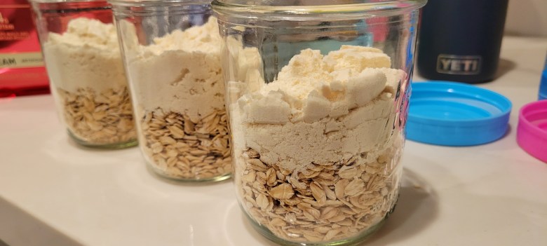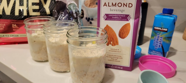1. At least 8-10 hours before you want to eat, combine the oats, protein powder, and almond milk in your vessel of choice. I use a 16 oz. jar which is perfectly sized for this total amount of food.