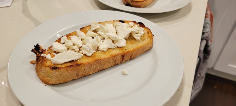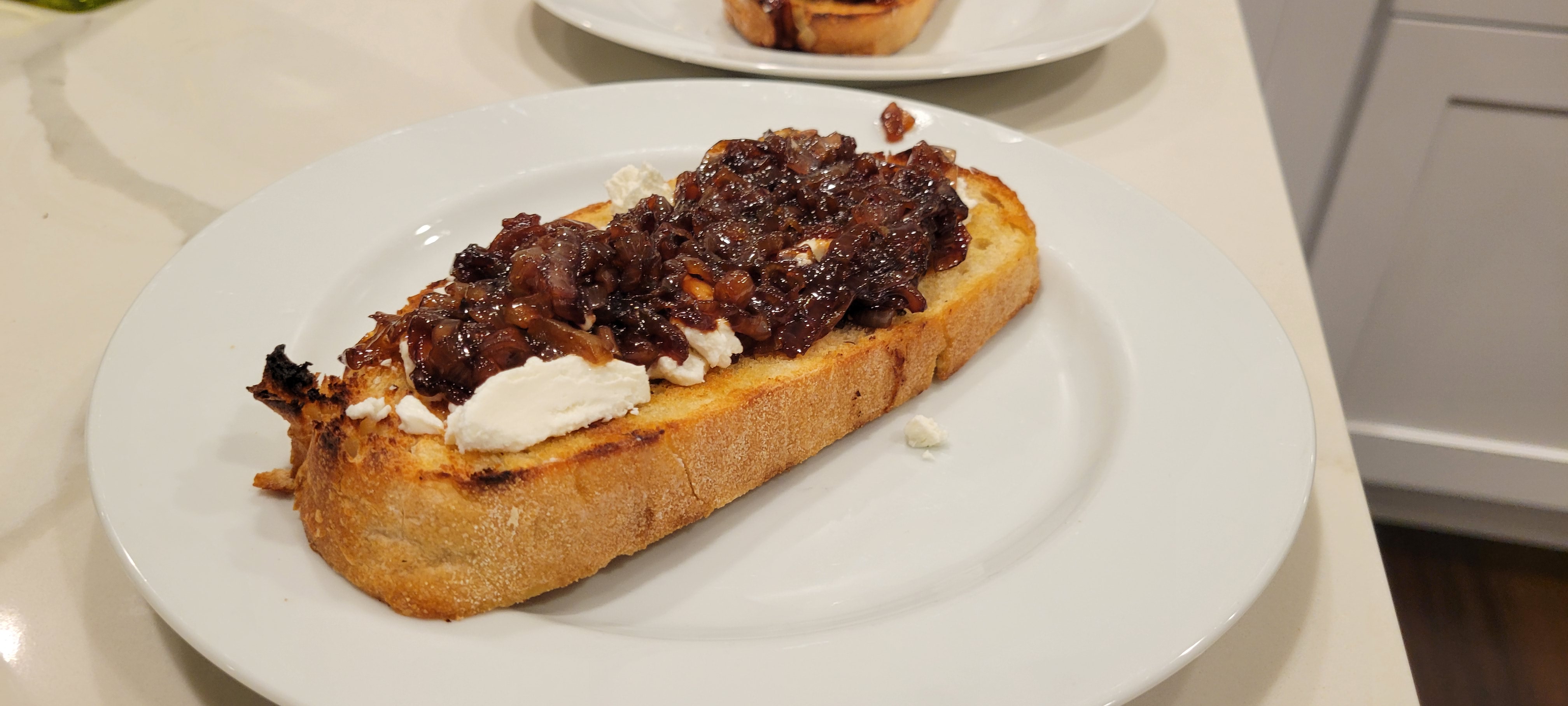- As the first layer, crumble a desired amount of goat cheese on the bread. Goat cheese provides just a hint of that characteristic sharp, tart, smooth flavor that is a great contrast to the onions. In a pinch, or if goat cheese isn’t your thing, some shredded extra sharp cheddar will do nicely.