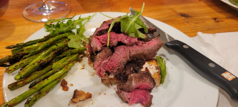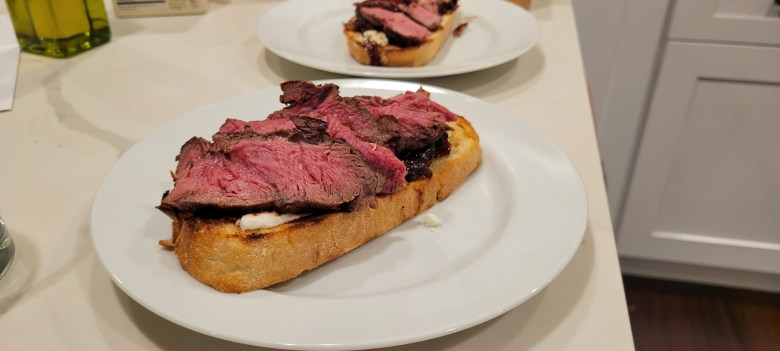 - The layers of steak come next. I usually go with about 5-6 oz of something tender but simple, like flat iron, sliced very thin and piled in overlapping layers.
