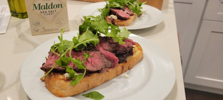- Finally, some arugula leaves, and a pinch of Maldon sea salt flakes make for the perfect final touch. The arugula gives the whole thing a pop of green, and lends that peppery, leafy goodness, and the Maldon salt does what Maldon salt does; make it even more delicious.