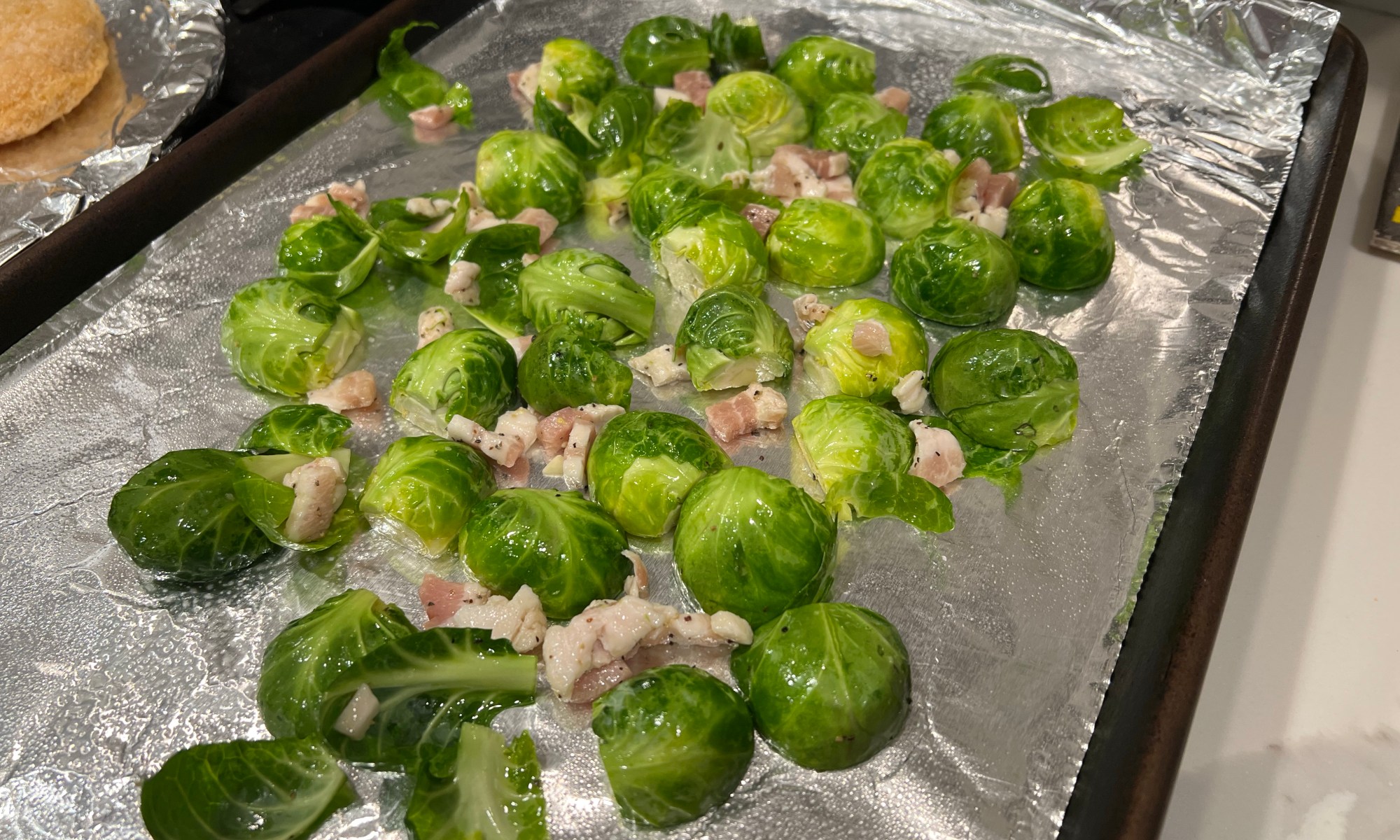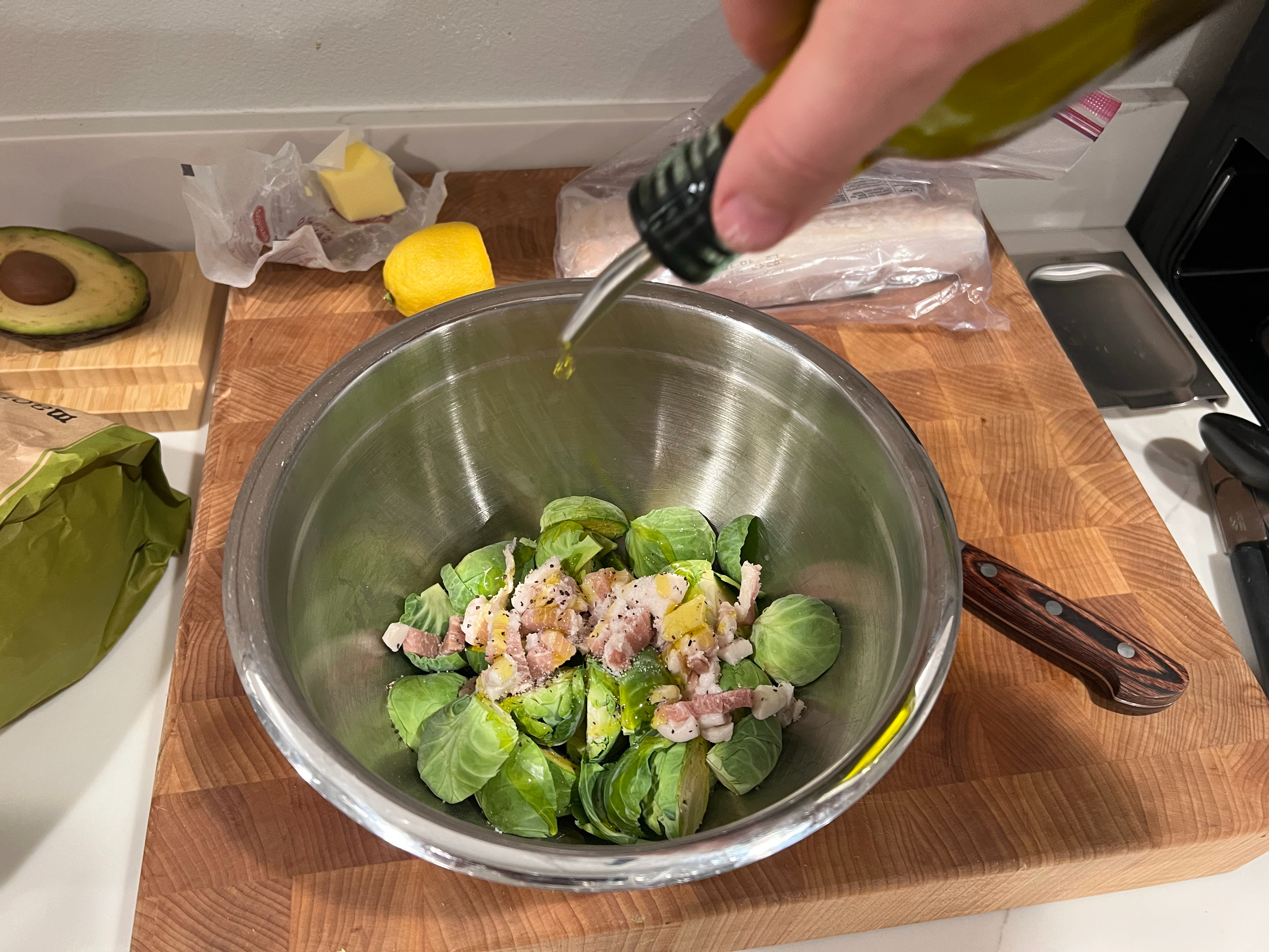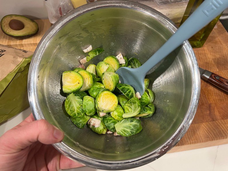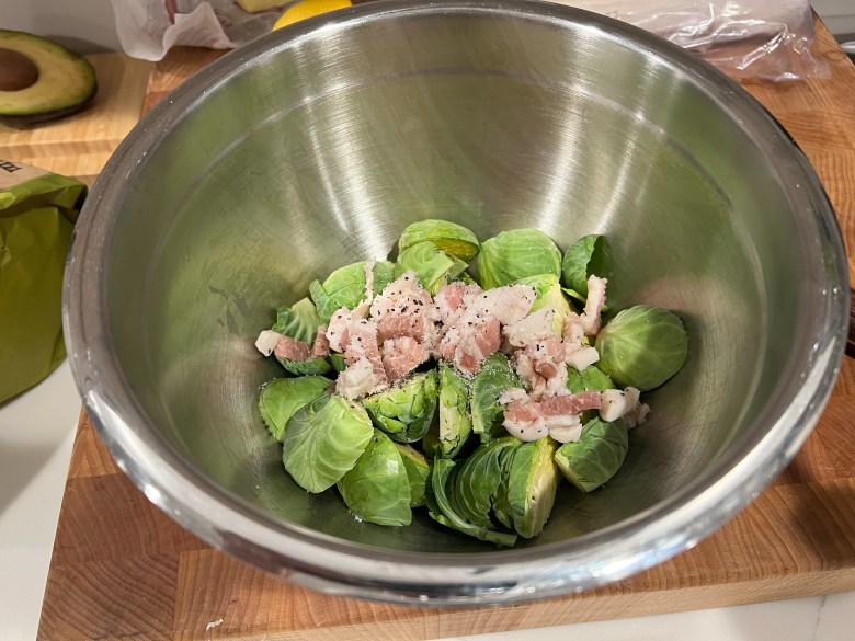 - Place the sprouts, bacon and salt and pepper into a mixing bowl, and then toss it all with the olive oil. If you like some additional spice, I’d suggest adding a pinch of cayenne pepper or chipotle chili powder at this point as well.