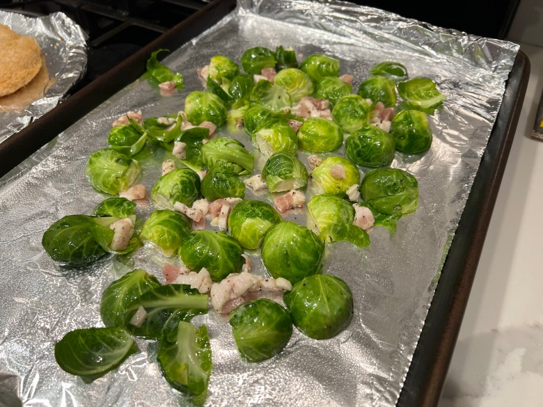 - Scoop the mixture onto a baking sheet (like for cookies) and – if you want extra crispy sprouts – flip them all so they’re cut-side down.