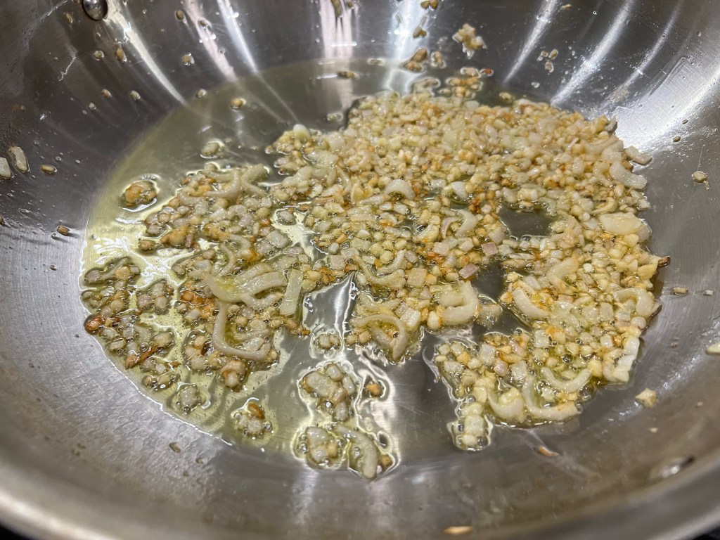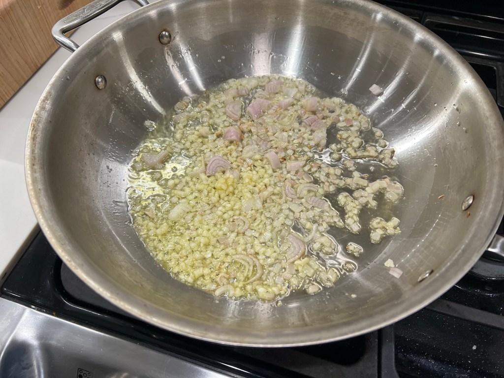 - In a large sauté pan, heat the olive oil over medium heat. When the oil shimmers, place the diced shallots and minced garlic in the pan, and sauté for 1-2 minutes.