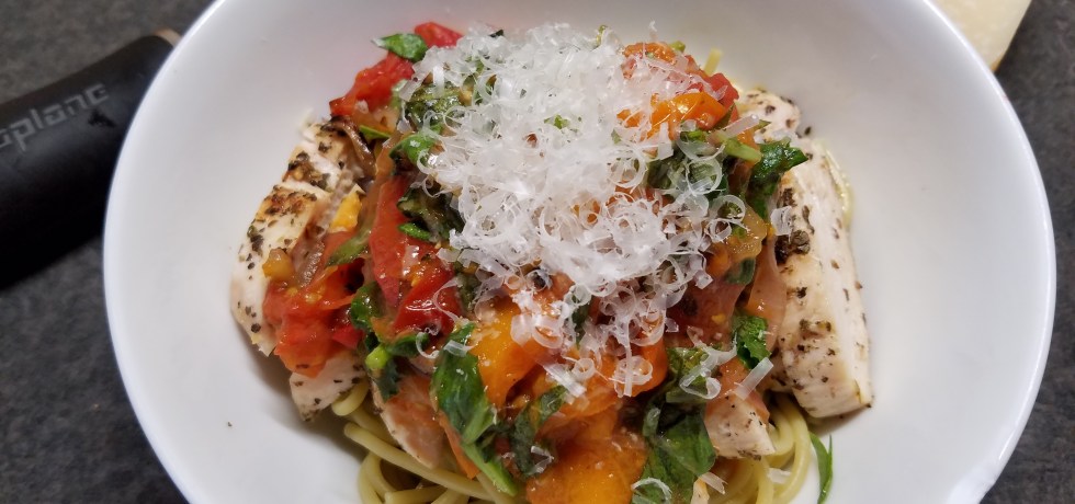 Italian-Inspired Stuffed Turkey Burgers with Pasta and Grilled Pepper Sauce